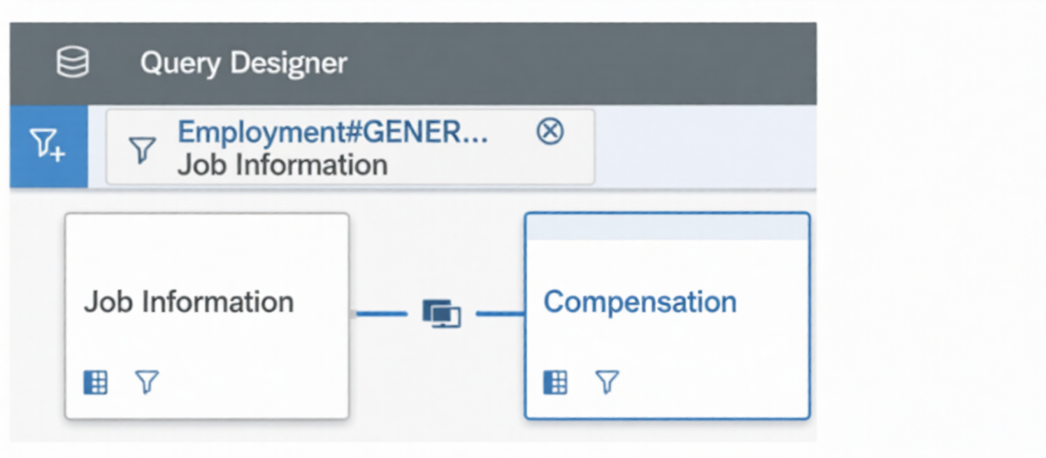 You are creating a query for a historical compensation story report in Query Designer. You have added the Job Information table to the query, configured a scope filter, and previewed the result to verify you are returning the appropriate employees. You add the related table Compensation to the query.